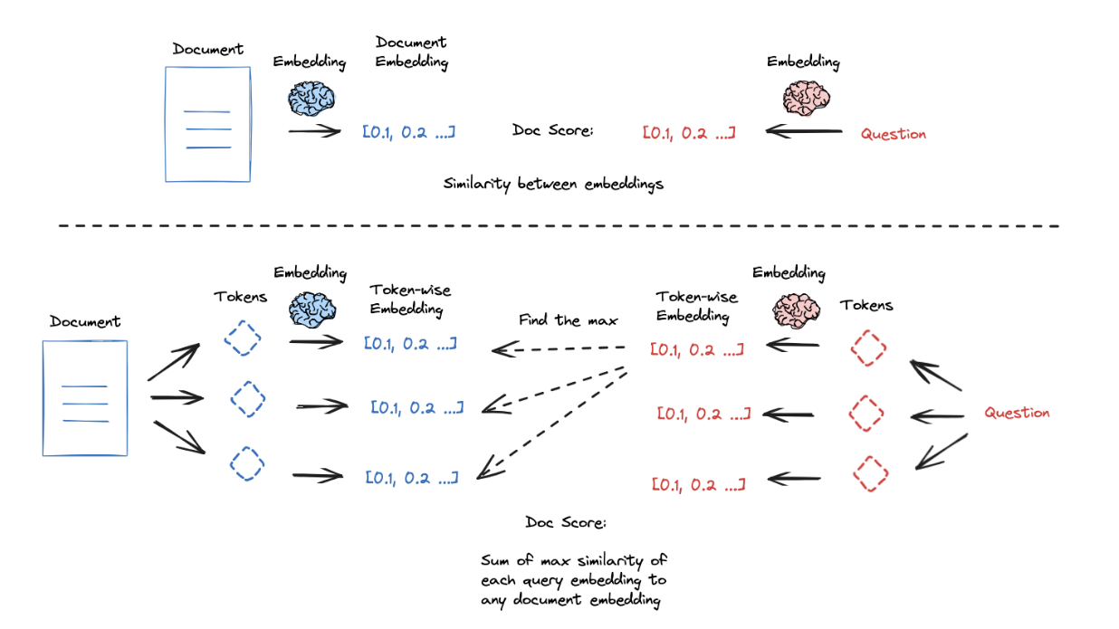 ColBERTWhen higher granularity embeddings are needed.ColBERT uses contextually influenced embeddings for each token in the document and query to get a granular query-document similarity score.